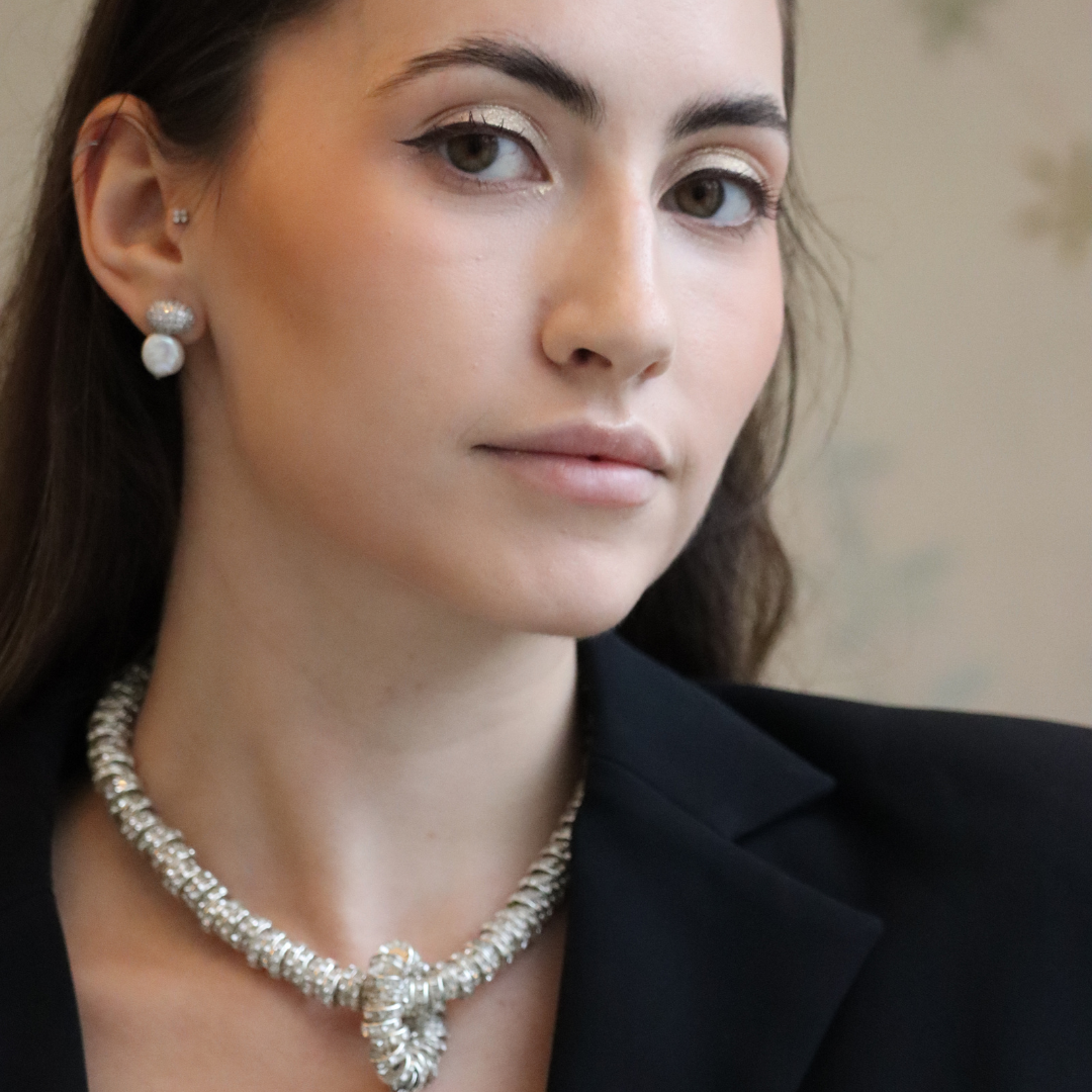 Un colier statement realizat din mărgele tip Rondelle Disc din oțel inoxidabil 316 și încrustate cu cristale strălucitoare, piesa centrală este o perlă baroc spectaculoasă ce adaugă un accent artistic și luxos.