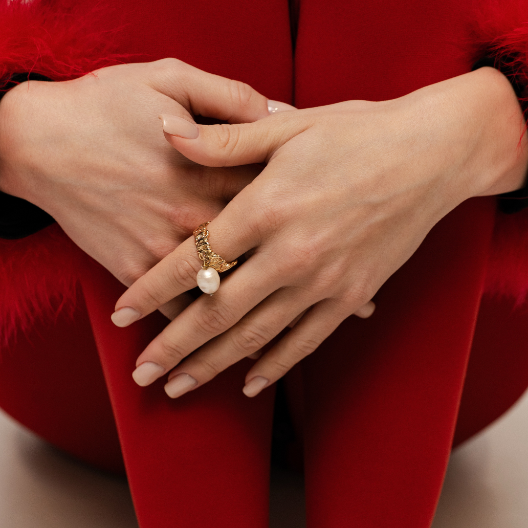 Eleganță pură într-un accesoriu rafinat – inelul Pavlova (22 mm, grosime 7 mm) surprinde delicatețea și frumusețea atemporală a perlei de cultură. Realizat din alamă și perle naturale.