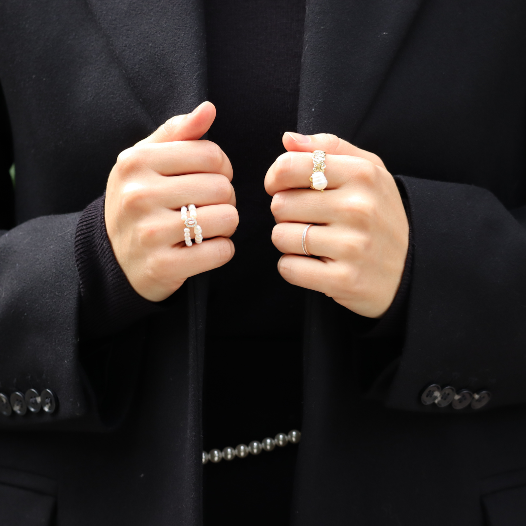 Inel cu două tipuri de perle și un element cu zirconiu strălucitor încastrat într-un cadru placat cu aur 14K. Designul este rafinat, delicat, dar totodată statement — perfect pentru a completa o ținută elegantă sau romantică.